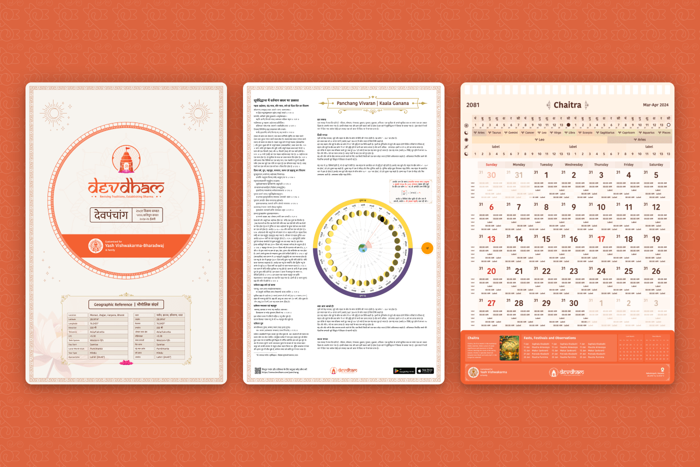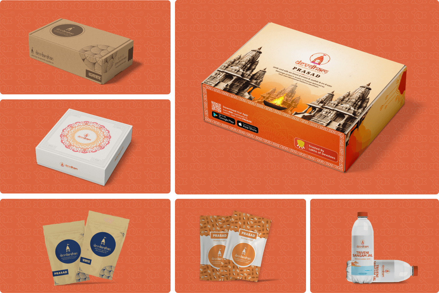 - Physical brand system: We design prasad packs & boxes (incl. color variants), standees, canopy kits, calendars, and other ground-ops assets.