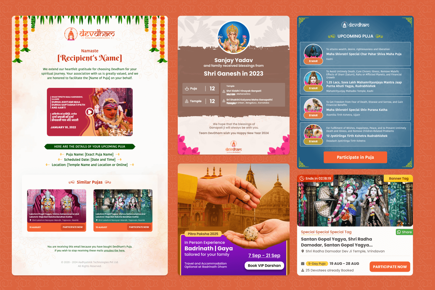 - Marketing at scale: We build reusable templates and ad/post sets to support 100+ puja launches per month (internal ops cadence).